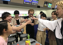 ▲ピンが倒れなくたって気にしない! カンパ〜イ! |