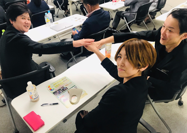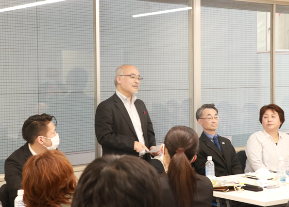 | ▲皆さんでディスカッションします。 | ▲普段行っている朝礼や体操などを 見学して頂きます。 |