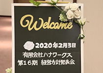 | ▲第16期経営方針発表会です。 ウェルカムボードは手作りです。 | ▲ヘアショーを行いました。 お客様にもご協力頂きました。 |