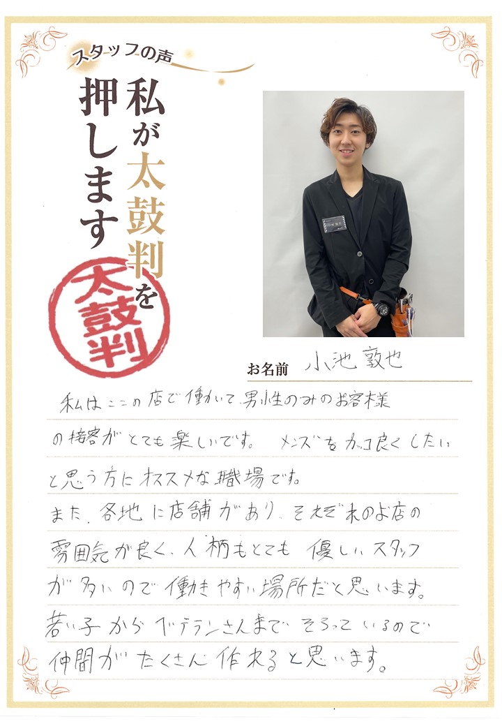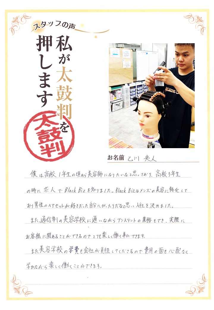 在籍スタッフの声-01 | “男性専用”美容室(メンズサロン)ブラックビズ 美容師求人募集 『東京銀座店・新宿店・池袋店・横浜店・大阪梅田店』